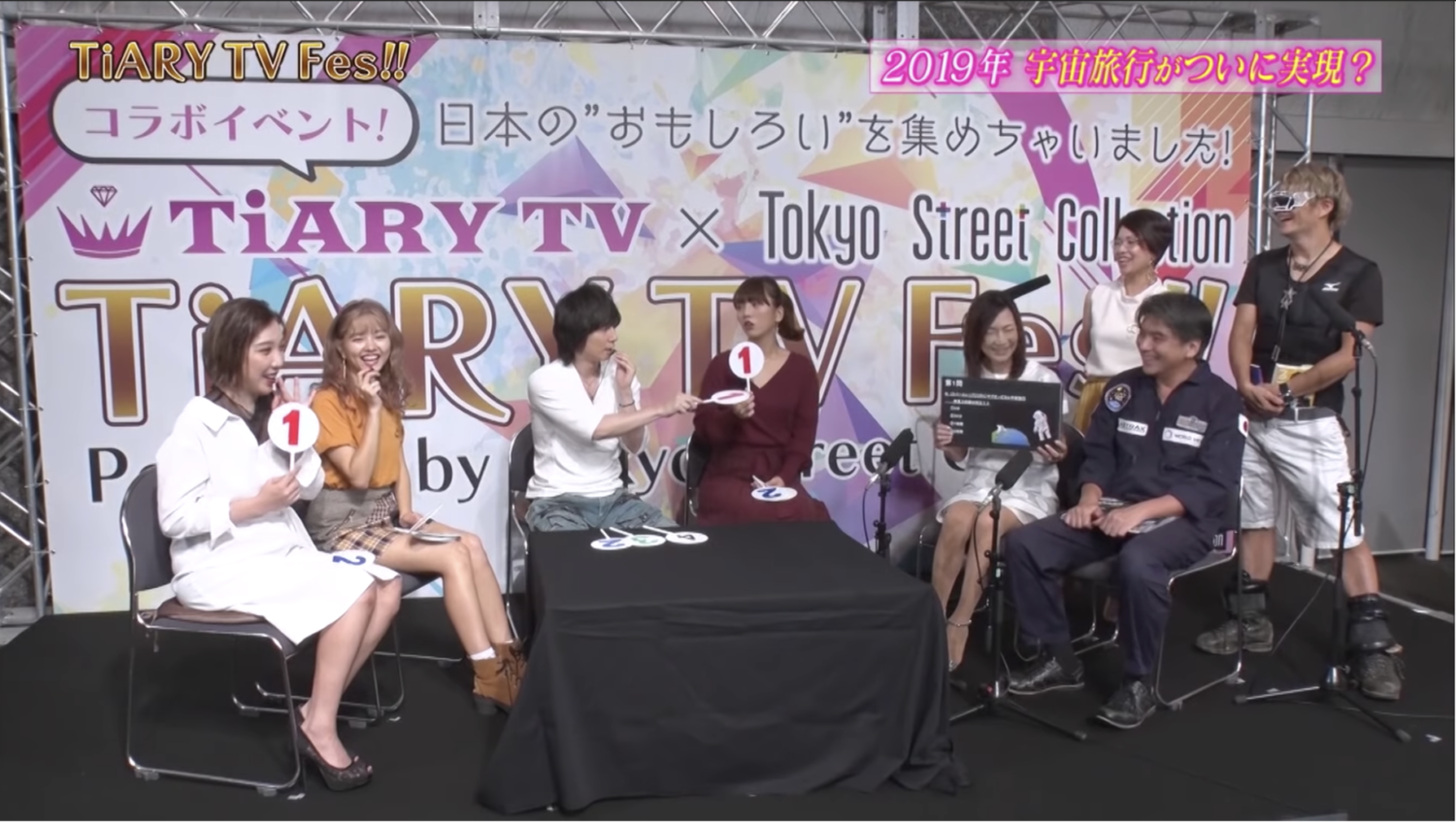 メインステージの後は、バラエティ情報番組「TiARY TV」の公開収録が行われました。山崎さんから本物の宇宙旅行のチケットを渡され、司会者もゲストも見て触って大興奮。大貫さんはクイズで宇宙旅行についてわかりやすく紹介してくださいました。